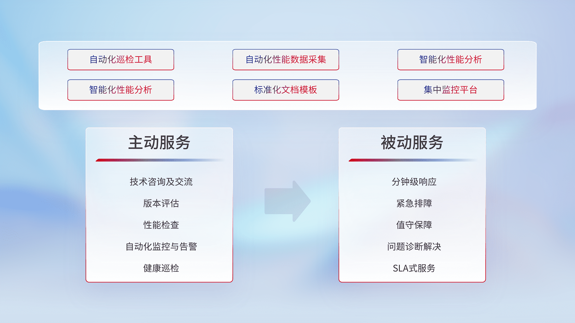 智能化工具和标准化文档,,保障服务质量,,,,提供主动服务(包含技术咨询、、、版本评估、、、性能检查、、自动化监控与告警、、、、健康巡检)和被动服务包含(分钟级响应、、紧急排障、、、、值守保障、、问题诊断解决、、SLA服务)。。
